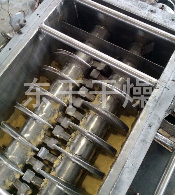 空心轴上密集排列着楔型中空浆叶,热介质经空心轴流经浆叶。单位有效容积内传热面积很大,热介质温度从-40℃到320℃,可以是水蒸汽,也可以是液体型:如热水、导热油等。间接传导加热,没有携带空气带走热量,热量均用来加热物料。热量损失仅为通过器体保温层向环境的散热。楔型浆叶传热面具有自清洁功能。物料颗粒与楔型面的相对运动产生洗刷作用,能够洗刷掉楔型面上附着物料,使运转中一直保持着清洁的传热面。浆叶干燥机的壳体为Ω型,壳体内一般安排二到四根空心搅拌轴。壳体有密封端盖与上盖,防止物料粉尘外泄而充分发挥作用。