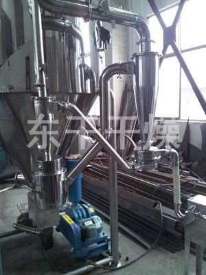 该机采用全封闭形式,所有部件均采用不锈钢制造,配有三级净化装置,过滤后的空气达十万级要求。筒体与顶部装有冷壁装置,使壁温<80℃,干燥塔内装有气刷扫塔装置。经该机干燥后的中药浸膏粉,不会出现焦化变质现象,大大增加了收粉率(95%以上),而且不会产生混药现象和粘壁现象。