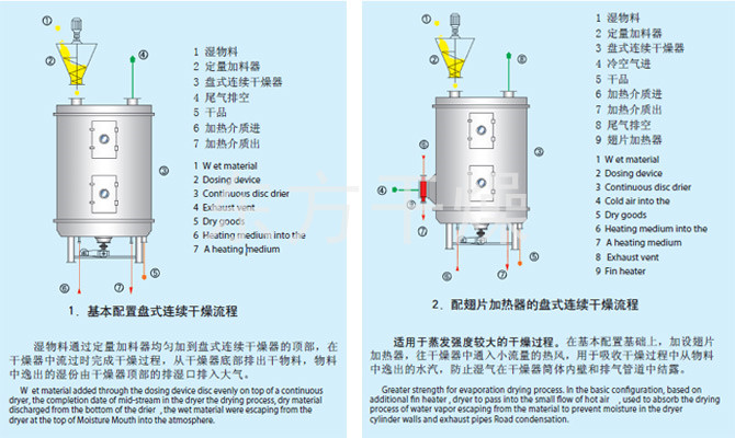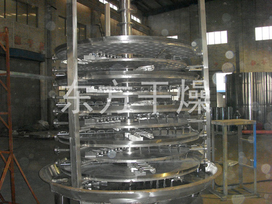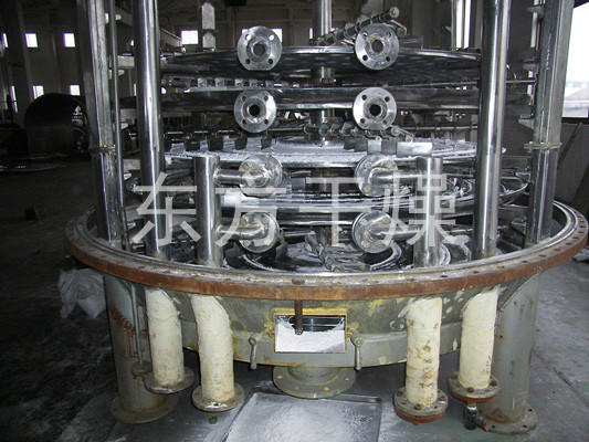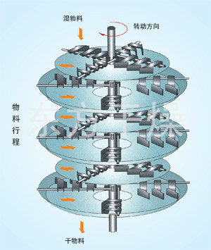 Wet material continuously fed from the feeder on the upper portion of the first layer of drying plate dryer with rake leaf rake arm rotary movement of the digging arm rotary movement so continuously rake leaves turn copied material. Index material along the spiral flow through the disk surface drying, the material was dried in a small disk is transferred to the outer edge, and falls below the outer edge of the large drying plate at the outer edge, on a big plate material moved inward and drop from the middle spout off as one small drying pan. Size drying plates are arranged alternately, the material can be continuous through the whole dryer. Heating medium through the hollow of the dry plate, heating medium in the form of saturated steam, hot water or thermal oil heating medium enters from one end of the dry plate exported from the other end. Dried materials fell on the bottom of the housing from the last layer of drying plate, the last being transferred to rake leaves out of the discharge port. The moisture escaping from the material discharged from the humidity on the top cover of the mouth, a vacuum-type plate dryer moisture is discharged by the vacuum pump on the top cover of the mouth. Discharged from the bottom of the dry materials can be packed directly. By finned heater with addition, solvent recovery condensers, baghouse, dry material backmixing agencies, induced draft fan and other auxiliary equipment, can increase its drying capacity, dried paste and heat sensitive materials can be easily recycled The solvent and capable of heat decomposition and reaction.