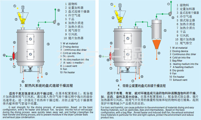 Disc continuous dryer is a highly efficient conduction of continuous drying equipment. Its unique structure and operating principle determines that it has high thermal efficiency, low energy consumption, small footprint, simple configuration, convenient control, good operating environment and other characteristics, widely used in chemical, pharmaceutical, pesticide, food, feed, farming product processing and other industries drying operation. Well received in various industries practice. Now manufacturing pressure, sealed, vacuum three types, 1200,1500,2200,3000 four kinds, A (carbon steel), B (contact material part of the uniform stainless steel), C (on the basis of B to increase the steam pipe Road, spindle and bracket stainless steel, lined with stainless steel barrel and cap top). Three materials, dry area 4 ~ 180m 2, a total of hundreds of models of products, and can provide a matching types of auxiliary equipment, users can meet the needs of a variety of materials to dry.