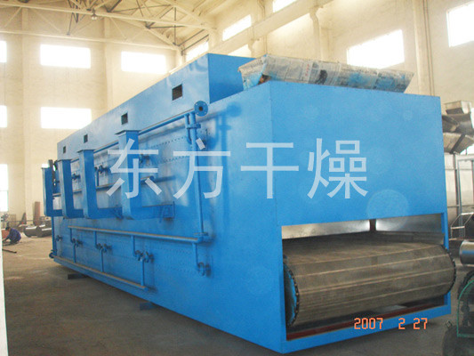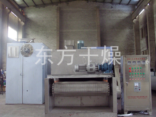 The material on the belt from the feeder evenly over the mesh belt generally adopts 12-60 mesh stainless steel mesh, drag from the gear in the dryer moving. Drying machine consists of several units, each unit independent hot air circulation, humidity and the fan portion of the tail by specialized discharged from the exhaust gas control valve, the heat from bottom to top or from top to bottom through the material covered belt complete with heat mass transfer process, material moisture away. Belt moves slowly, running speed can be freely adjusted according to the material temperature, the finished product after drying receive continuous fall feeder. Upper and lower circulation unit can be flexibly equipped according to user needs, according to the number of units you may also need to select.